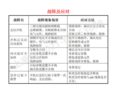 3.電源電壓正常,至各溫區依次打開加熱開關,按所需各目標參數寫入各區控溫表和超溫表,系統啟動工作。工業烤箱具體緊急處理方法見下表: